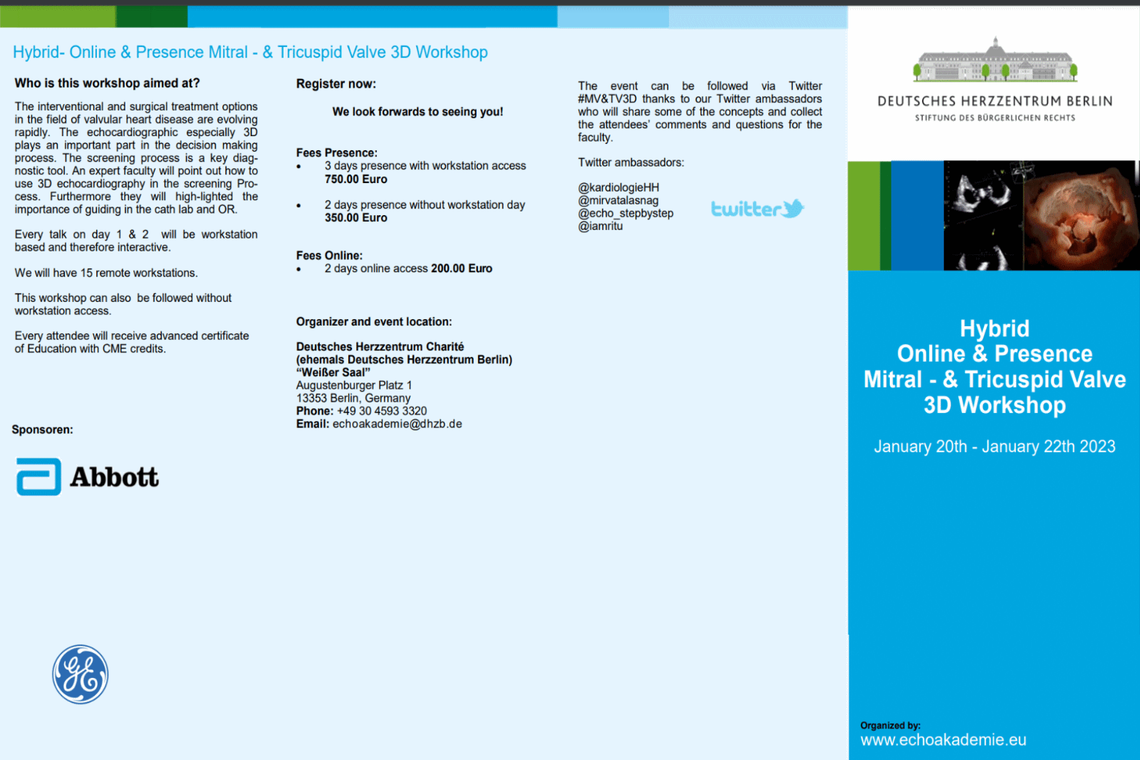 The interventional and surgical treatment options in the field of valvular heart disease are evolving rapidly. The echocardiographic especially 3D plays an important part in the decision making process. The screening process is a key diag- nostic tool. An expert faculty will point out how to use 3D echocardiography in the screening Pro- cess. Furthermore they will high-lighted the importance of guiding in the cath lab and OR.